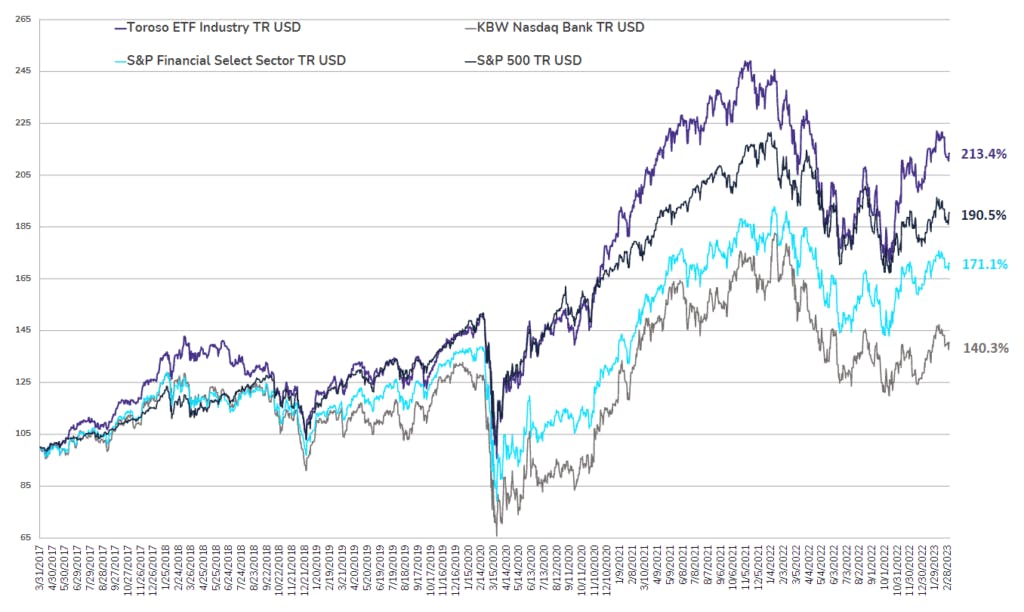 The highlighted indexes experienced similar performance last week. The Toroso ETF Industry Index was up 0.66% while the S&P Financial Select Sector Index led at 0.88%.