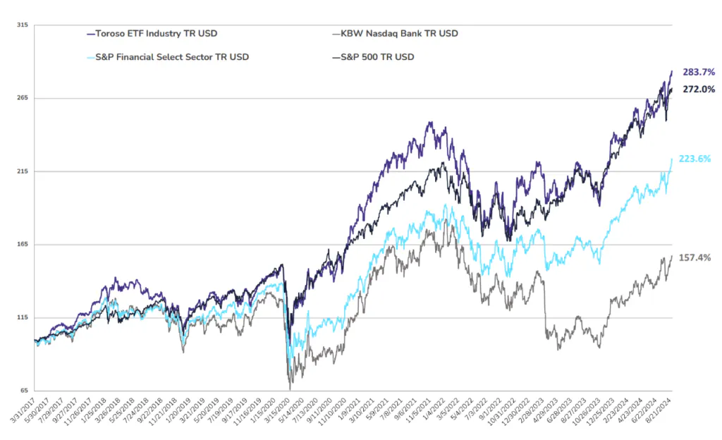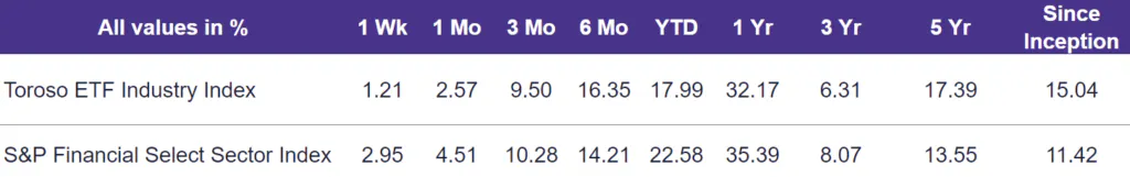 Our Toroso ETF Industry Index, which tracks companies generating revenue from the ETF ecosystem, rose 1.21% last week, underperforming the S&P Financial Select Sector Index, which rose by 2.95%.