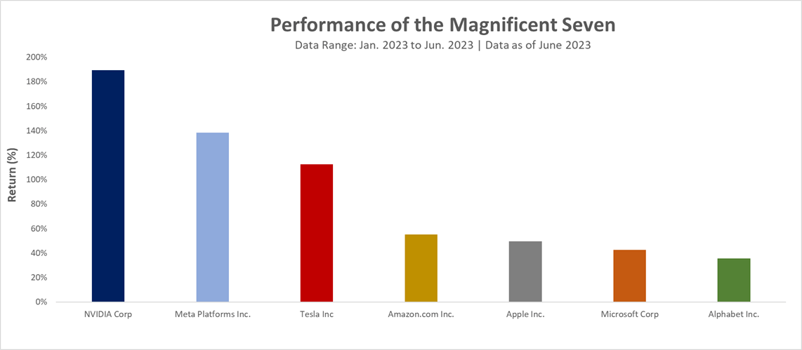 The ‘Magnificent Seven’ is comprised of Apple, Microsoft, Alphabet, Amazon, Nvidia, Tesla, and Meta Their performance during the first half of the year has been truly noteworthy. As observed from the chart, the performance of NVIDIA Corp has been exceptional, as the fervor around Artificial Intelligence has pushed the company to new heights, with it now having a $1 trillion market capitalization. As mentioned in a previous article, the company’s last quarterly earnings report noted that over $2 billion in profit was generated for the reporting period. Regarding Meta Platforms, progress in improving ad efficiency and the utilization of AI tools has increased monetization efficiency across their family apps. With the recent launch of Threads, the firm is looking to broaden its app ecosystem and strengthen its dominance as the premier social media platform provider.