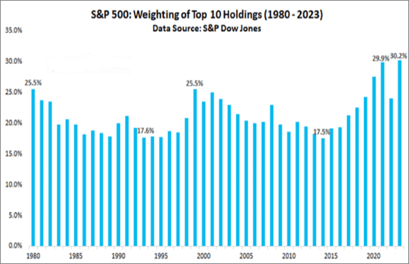 Against the backdrop of a market environment that has seen a rapid increase in interest rates to combat inflation, the conventional expectation was that growth-focused technology businesses would be adversely impacted by continual rate increases. In actuality, the strong financial performance of the Magnificent Seven within the tech sector has lifted equities markets; this is particularly important as they are the leading firms within the top 10 holdings of the S&P 500 Index- which now accounts for approximately 30% of the index’s market capitalization.