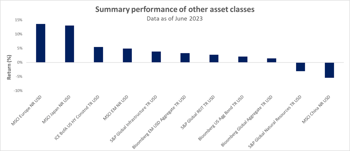 Though the resurgence of US equities has taken the headline space for many investors, other markets have exhibited strong performance in the year thus far. From an equity standpoint, the performance of the European and Japanese markets has been strong, whereas Chinese equities have disappointed, especially given the enthusiasm that was present about their economic re-opening. Among the fixed income asset class, the performance of US high-yield debt truly stands out in comparison to its asset class peers. Finally, the performance of global infrastructure and global REITs has been modest for the year.