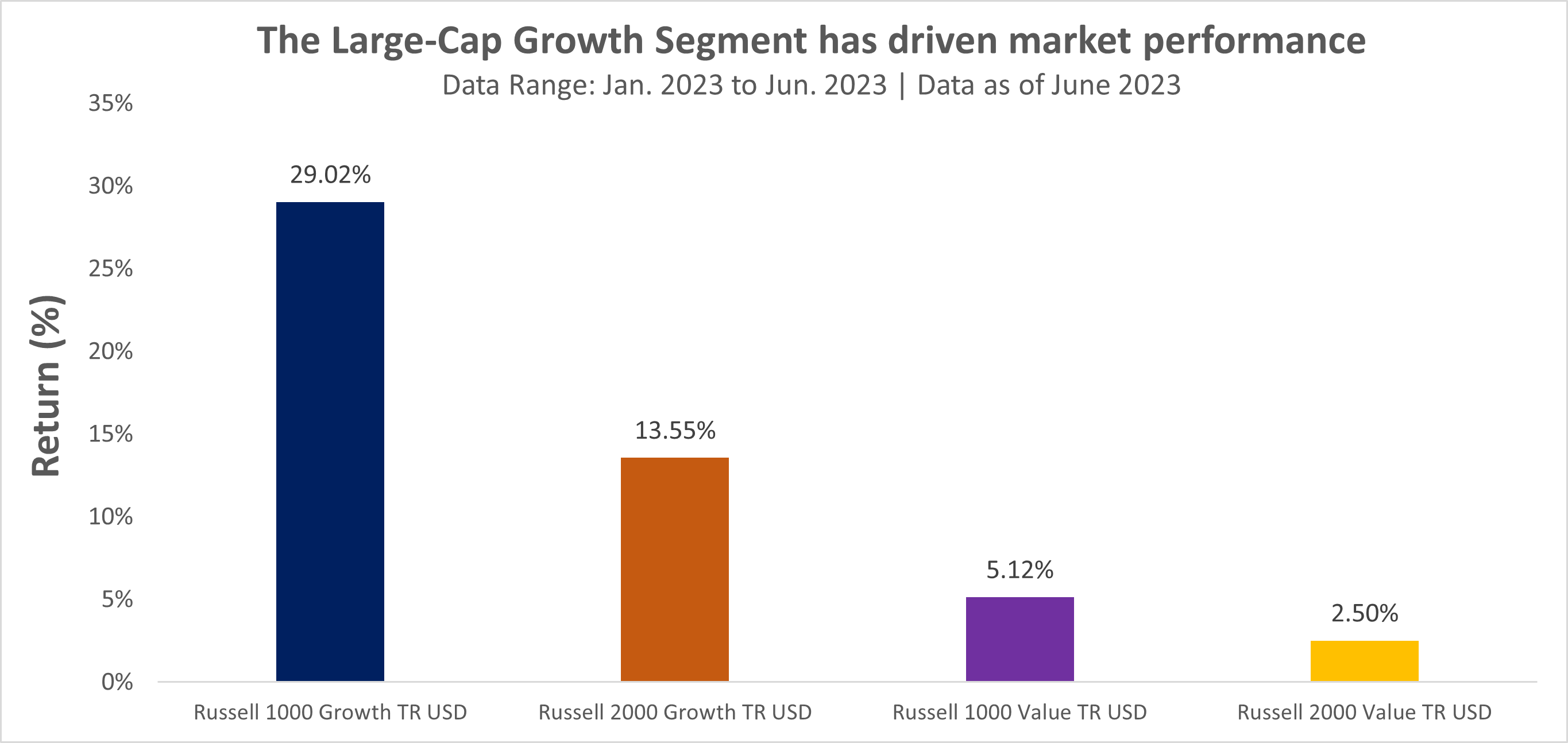 The performance of the Magnificent Seven, against the backdrop of an uncertain macroeconomic environment, has highlighted the strength of large-cap growth-oriented firms. As seen in the following chart, the performance of the Russell 1000 Growth TR Index has significantly outperformed other segments thus far in 2023.