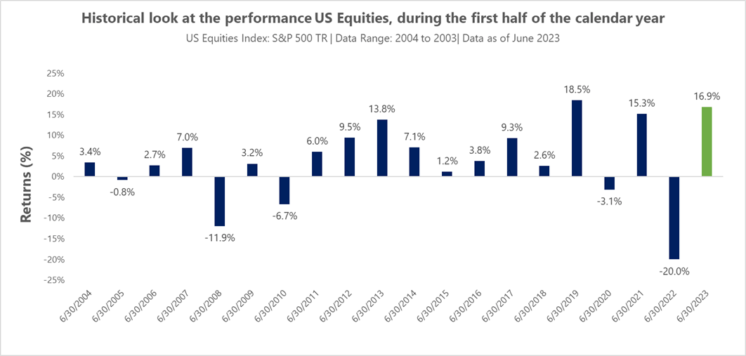 The first half of the year has been shaped by various market moving events – stubborn inflation, rising interest rates, banking failures, and a US debt ceiling crisis – that gave investors cause for concern. However, despite the occurrence of these events, the performance of US equities during this period, as evidenced by the S&P 500 Index, has been exceedingly strong, especially when placed in a historical context.