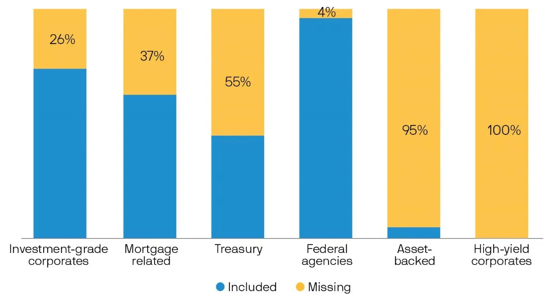 While the S&P 500 Index captures more than 80% of the U.S. stock market, bond indices are less reflective of the markets they seek to emulate. The benchmark for U.S. investment-grade bonds, the Bloomberg US Aggregate Bond Index (also known as “the Agg”), captures only 49% of the U.S. bond market. Diversified core fixed income investors need to be aware that the Agg remains highly concentrated in U.S. Treasury and agency mortgage-backed securities (MBS), which represent nearly 70% of its underlying assets. The index’s rule-based construction, designed in the 1980s, excludes many securities that investors prefer to deploy in a modern, well-diversified portfolio: certain agency mortgage securities, most asset-backed securities and approximately 40% of all corporate bonds.