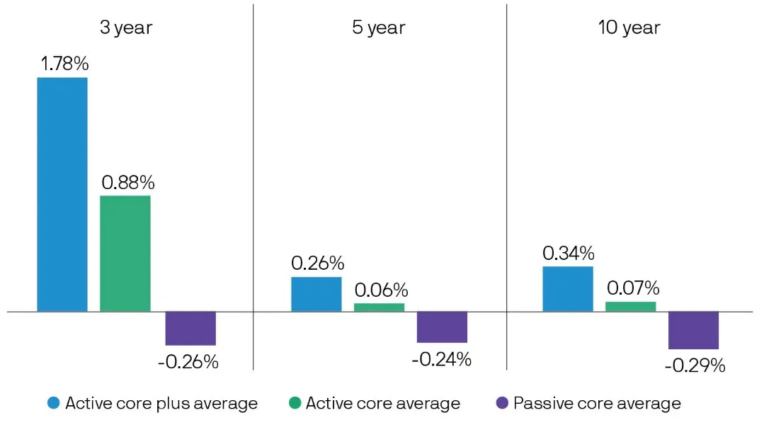 Active fixed income management has shown its ability to deliver excess returns net of fees – a fact that may surprise some staunch advocates of passive investing in equities. Within each of the two largest bond fund categories – core bond and core-plus bond – the average active fund outperformed the Agg as well as the average passive core bond fund over various economic cycles.