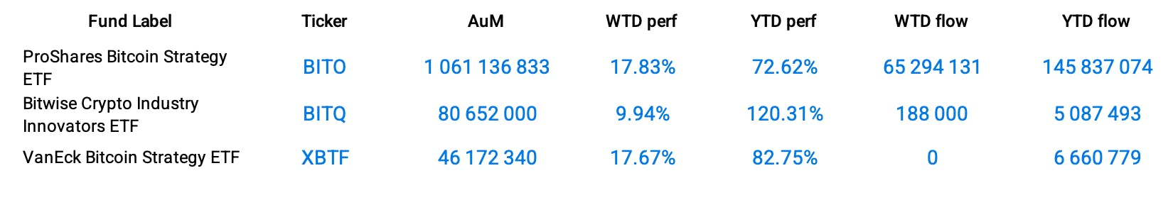 This bullish backdrop helps explain Bitcoin’s remarkable ascent, to reach its highest point in thirteenth months, surpassing the $30,500 mark. The ProShares Bitcoin Strategy ETF (BITO) thus gained +17.83% week-over-week, bringing its year-to-date performance to +72.62%. Meanwhile the Grayscale Bitcoin Trust jumped almost 27% over the week, up 131.48% YTD.