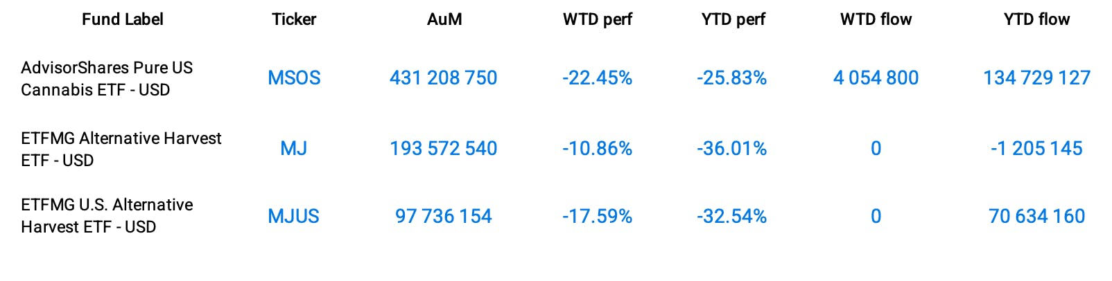 As an example, AdvisorShares Pure US Cannabis ETF (MSOS) witnessed a punishing week-over-week decline of 22.45%.