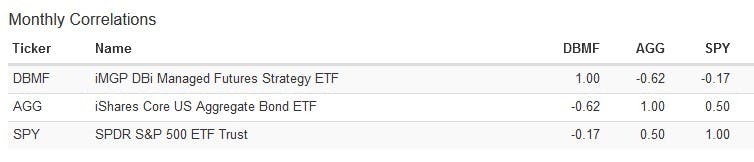 DBMF targets the gross (pre-fee) returns of the SG CTA Index, which tracks the performance of the top 20 CTA's and hedge funds. The ETF's quantitative "Dynamic Beta Engine" reverse-engineers the trailing 60-day performance of the SG CTA index to determine what its constituents are invested in.