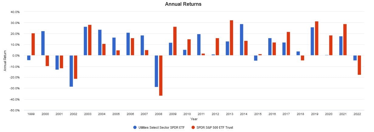 As seen below, the utilities sector of the S&P 500 has also historically outperformed the broader index, with lower max drawdowns during numerous bear markets such as 2000, 2008, 2018, and 2022.