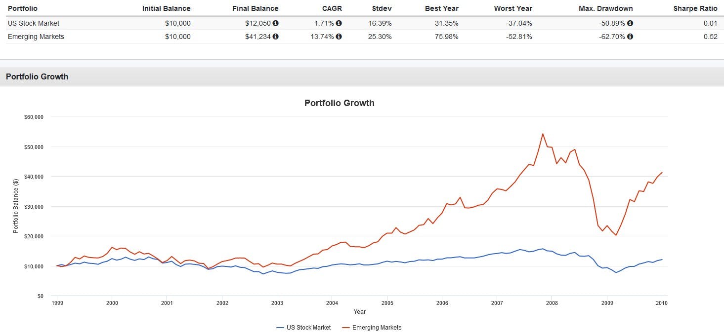 The U.S. market may have outperformed the rest of the world over the last decade, but this wasn't always the case. Older investors may remember the "lost decade" of 1999 – 2009. During this period, U.S. markets returned an annualized 1.71%, while emerging markets returned 13.74%.