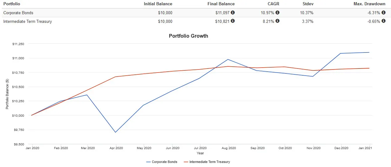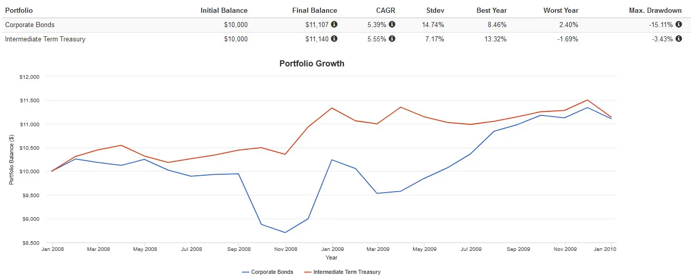 Simply put, this is the off chance that during a liquidity crisis and market crash that the issuer of the corporate bond cannot make good on the debt. Bond funds attempt to mitigate this issue by only holding higher credit quality corporate debt, usually AA, A, or BBB tier bonds. Regardless, this higher risk manifests itself in the higher correlation of corporate bonds with equities compared to Treasurys.