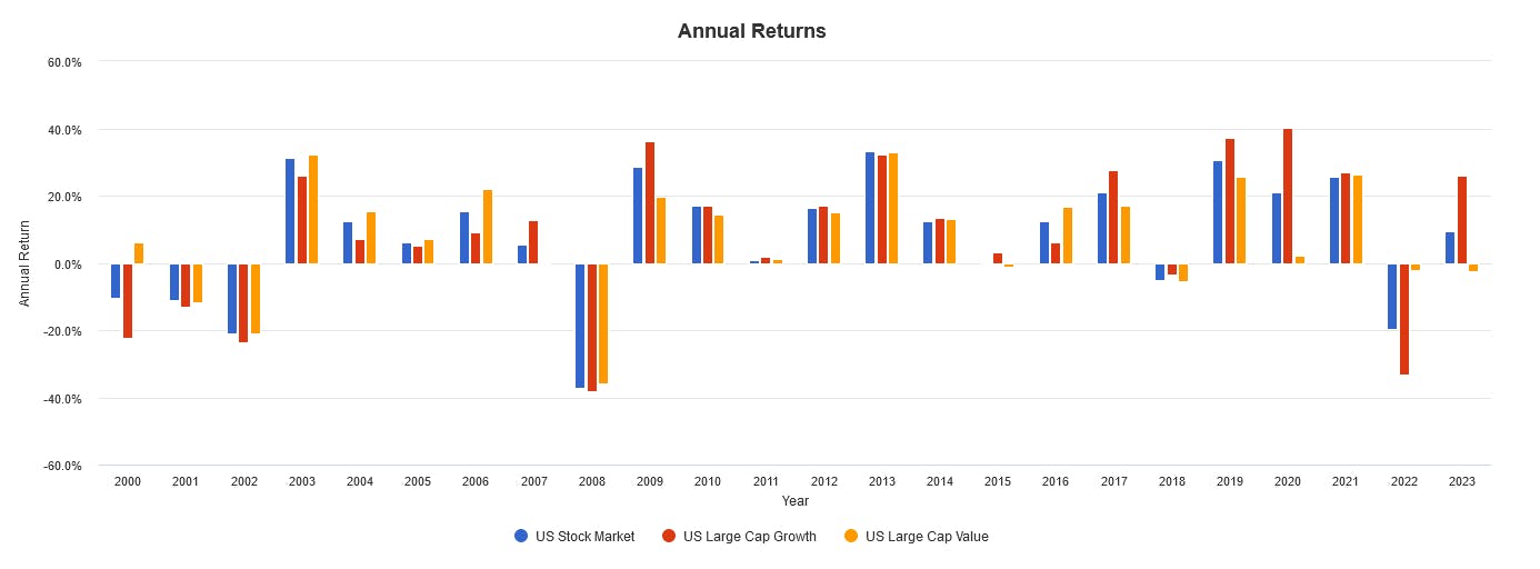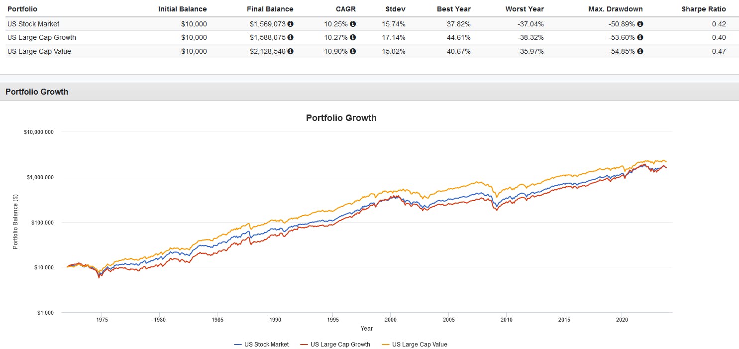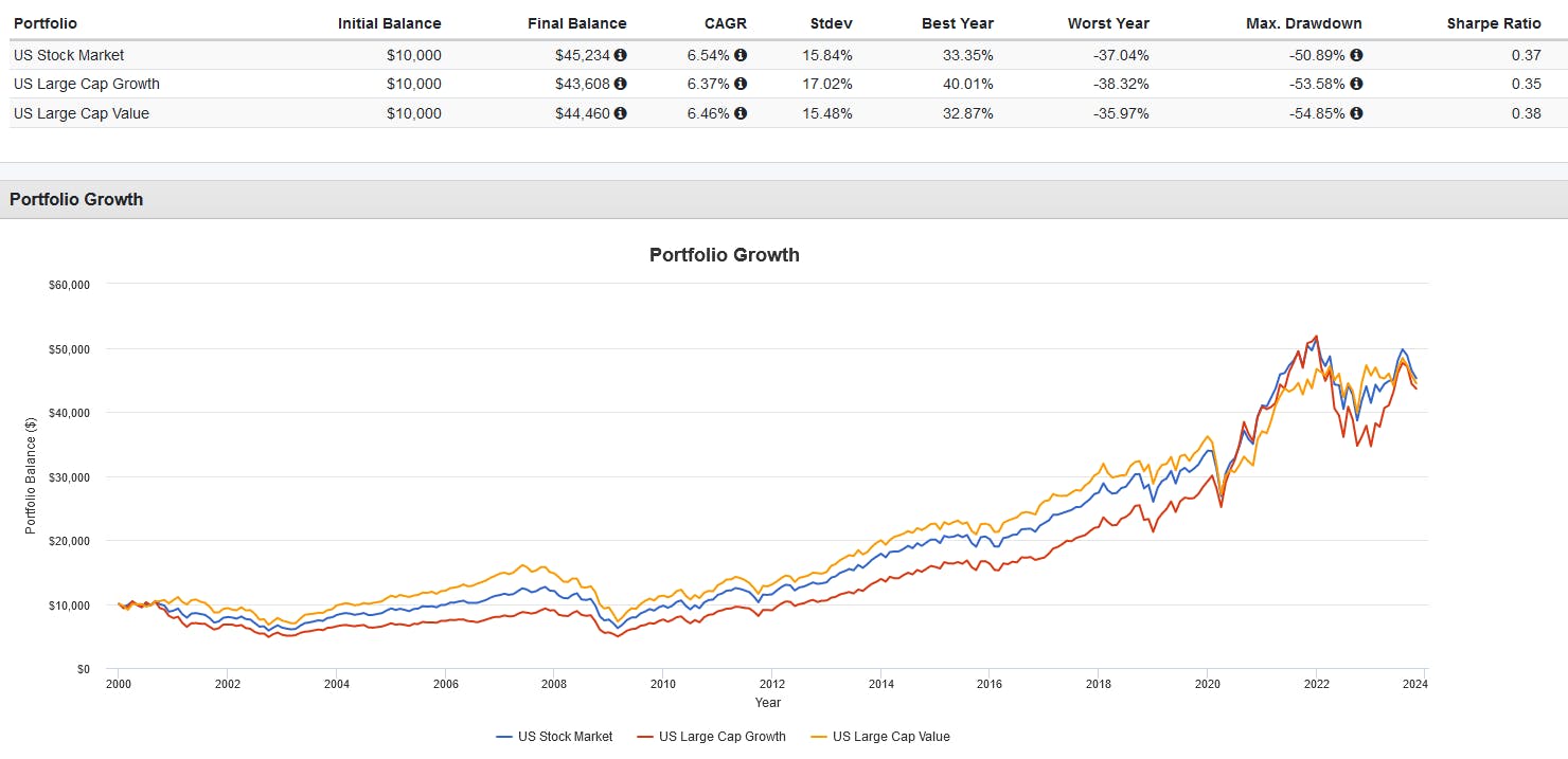 This parity was caused by deeper drawdowns experienced by growth stocks during periods like the dot-com bubble and the rising interest rate environment of 2022.