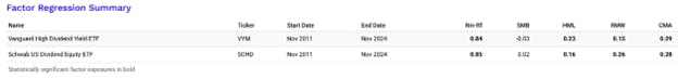 Factor regression analysis shows that both ETFs have statistically significant exposure to value (HML) and quality in the form of profitability (RMW) and investment (CMA). VYM has a stronger value tilt, while SCHD leans more toward quality factors.