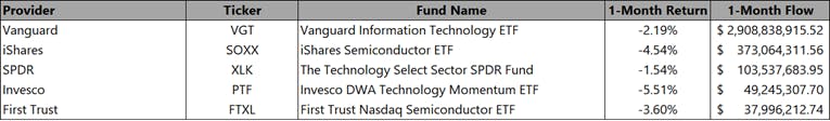 Though the technology sector had a negative performance for the month, but year to date its performance has been exceedingly strong and leads all other sectors. The Vanguard Information Technology ETF (Ticker: VGT) garnered the most flows for the month but had a negative performance. The iShares Semiconductor ETF (Ticker: SOXX) and First Trust Nasdaq Semiconductor ETF (Ticker: FTXL) had the second and fifth most flows, respectively, for the month. It is noteworthy to state that the Biden Administration announced expanding the restriction of exports of sophisticated Nvidia and Advanced Micro Devices artificial-intelligence chips beyond China to other regions including some countries in the Middle East during this month, which may have impacted the overall performance of the semiconductor industry.
