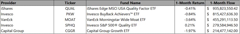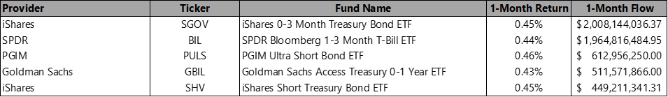 With interest rates currently at an elevated rate, and the potential that they may go higher, money market instruments have continued to garner strong flows as investors are capitalizing on their compelling yields. While the performance of the top 5 funds is fairly similar, the iShares 0-3 Month Treasury Bond ETF (Ticker: SGOV) and SPDR Bloomberg 1-3 Month T-Bill ETF (Ticker: BIL) garnered sizable flows for the month. As evidenced from the data, the flow drop-off from the top two, to the remaining three is notable – but PGIM Ultra Short Bond ETF (Ticker: PULS), Goldman Sachs Access Treasury 0-1 Year ETF (Ticker: GBIL), and iShares Short Treasury Bond ETF (Ticker: SHV) round out the group.