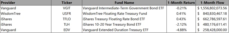 With interest rates remaining elevated, higher income from bonds has resulted in US Government Bonds remaining top of mind for investors. The Vanguard Intermediate-Term Government Bond ETF (Ticker: VGIT) garnered the most flows but had a negative performance for the month. The WisdomTree Floating Rate Treasury Fund (Ticker: USFR) and iShares Treasury Floating Rate Bond ETF (Ticker: TFLO) had the second and third most flows, respectively, and had a positive performance the month. Both of these ETFs are floating rate solutions that are tied to a short-term benchmark rate that adjusts periodically over time. The Vanguard Extended Duration Treasury ETF (Ticker: EDV) had the fifth most flows and had a negative performance for the month.