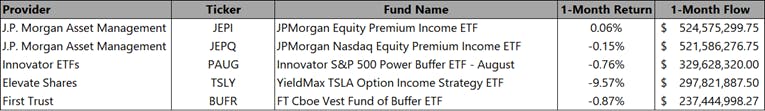 Though the performance of equity markets for the month has been negative, the trailing twelve-month returns have been positive across most sectors. Nevertheless, the structured products segment continues to garner flows as investors are still uncertain about the macroeconomic environment and its implications for the markets. The JPMorgan Equity Premium Income ETF (Ticker: JEPI) continues to be the top-of-mind solution for market risk mitigation by many investors, as evidenced by the strong inflows for the month and the modest positive performance. The JP Morgan Nasdaq Equity Premium Income ETF (Ticker: JEPQ) garnered the second most flows but had a negative performance. From a performance standpoint, the YieldMax TSLA Option Income Strategy ETF (Ticker: TSLY) had the worst performance of the group but garnered the fourth most flows.