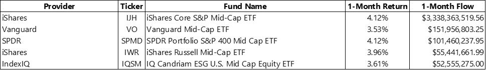 The mid-cap equity ETF segment has both fast-growing, young companies that have outgrown their small-cap origins, as well as mature companies operating in stable and profitable corners of the market. Though small-cap equities tend to exhibit greater volatility, and large-cap equities tend to be slow-growing, mid-cap equities capture the best of both worlds, as they are less volatile than fast-growing small-caps and have more growth potential than mammoth large-cap companies. Performance among the top 5 funds was particularly strong for the month, but the iShares Core S&P Mid-Cap ETF (IJH) garnered the most fund flows and had the best performance among the group; the SPDR Portfolio S&P 400 Mid Cap ETF (SPMD) had a similar performance but took in the third most flows. Though the iShares Russell Mid-Cap ETF (IWR) and IQ Candriam ESG U.S. Mid Cap Equity ETF (IQSM) outperformed the Vanguard Mid-Cap ETF (VO), the latter’s monthly flow was greater than the combined net flows of the two previously mentioned ETFs.