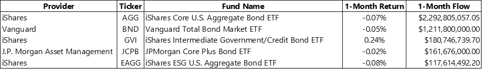 US Aggregate Bonds have received strong inflows for the month, however performance was flat or negative. The iShares Core U.S. Aggregate Bond ETF (AGG) garnered the most flows, followed by the Vanguard Total Return Bond Market ETF (BND), and iShares Intermediate Government/Credit Bond ETF (GVI). Though the performance among many of the ETFs was similar, the iShares Intermediate Government/Credit Bond ETF was the only solution to have a positive performance (0.24%), whereas all others were slightly negative for the month.