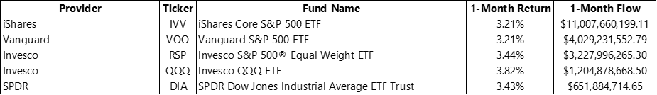 The ETF segments that had the greatest net fund flows for the month were US Large Cap ($16.30 bn), Structure Products ($4.09 bn), US Mid Cap ($3.64 bn), US Government Bonds ($2.85 bn), and US Aggregate Bonds ($2.83 bn).