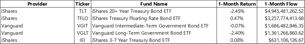 With interest rates remaining elevated, higher income from bonds has resulted in US Government Bonds remaining top of mind for investors. The iShares 20+ Year Treasury Bond ETF (TLT) had the largest inflow for the month, but had the worst performance among its immediate group. The iShares Treasury Floating Rate Bond ETF (TFLO) garnered the second largest flows and had a positive performance for the month. As the name suggests, floating rate bonds are tied to a short-term benchmark rate that adjusts periodically over time. The iShares 3-7 Year Treasury Bond ETF (IEI) was the only other ETF to have a positive performance among the group.