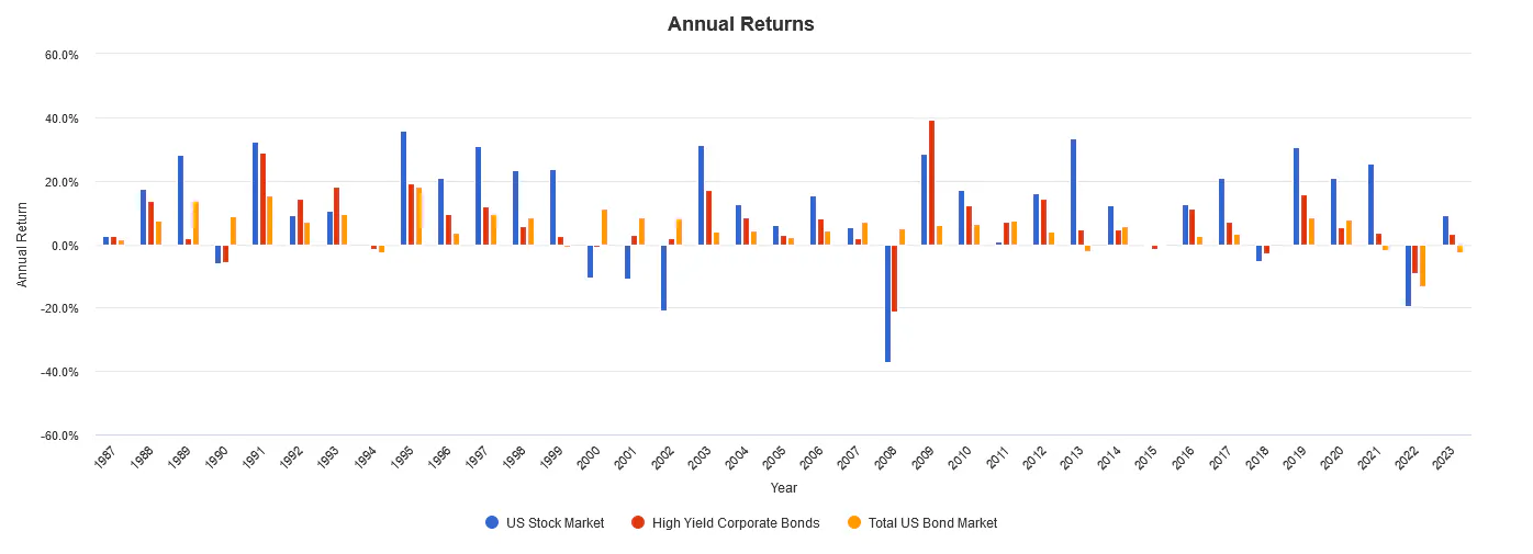However, they usually exclude a particular type of bond that stands apart in terms of risk and return: high-yield bonds, commonly referred to as "junk bonds." High-yield bonds are distinct within the fixed income asset class, primarily due to their unique risk-return profile, which we will explore later.