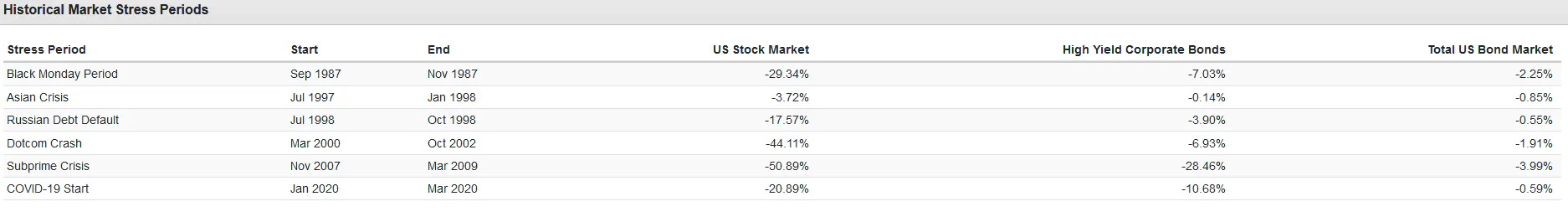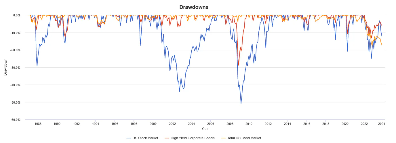 These stellar yields come at a cost though. The much higher credit risk of these bonds has historically resulted in steep drawdowns during various economic crises. When turmoil strikes, worries of their issuers defaulting come to the surface, and these bonds can sell-off.