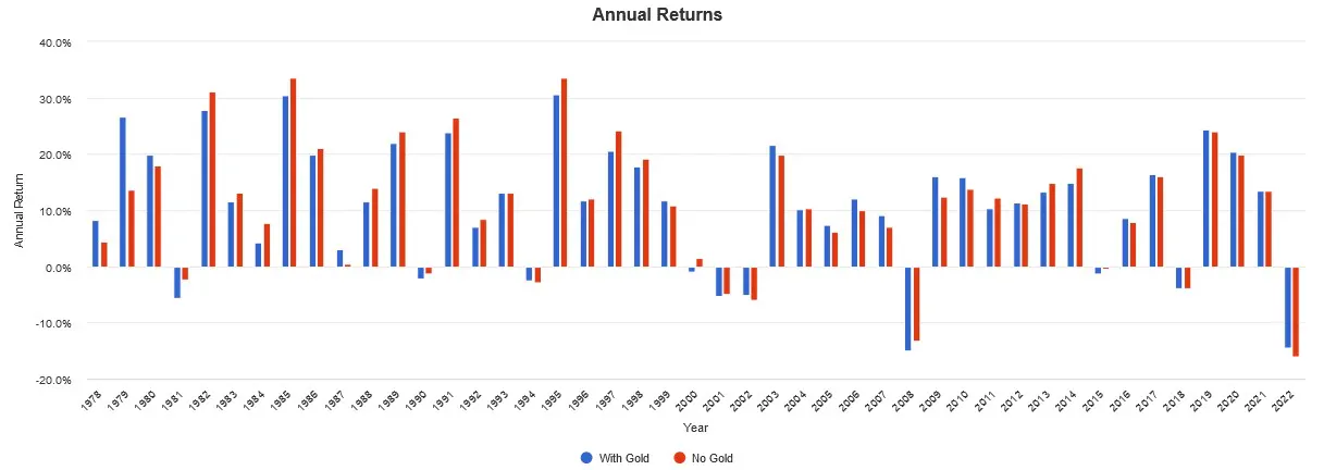 Gold has a low correlation with both, which according to Modern Portfolio Theory, should make it great as a diversifier. Indeed, a portfolio of 60/30/10 stocks/Treasurys/gold has historically produced a similar risk-adjusted return than a 60/40 stocks/Treasury portfolio, with slightly lower volatility and drawdowns.