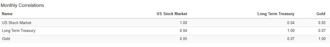 That is, when stocks and bonds zig, gold can zag. Mixing all three in various proportions can produce more return for less risk, thereby optimizing your portfolio further. Look at this table comparing monthly correlations between the U.S. stock market, long-term Treasurys, and gold from 1978 to the present: