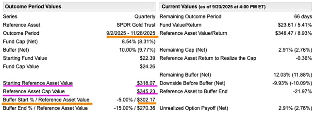 In the current target outcome period (Sep 2 to Nov 28), BGLD seeks to match GLD’s returns up to a predetermined upside cap of 8.54% ($345.23) while providing a buffer against GLD losses between -5% ($302.17) and -15% ($270.36).