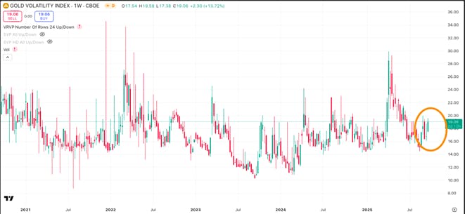 This makes non-interest-bearing GLD vulnerable to volatility (GVZ – the Gold Volatility Index), raising the cost of call spreads without guaranteeing that long exposure will pay off.