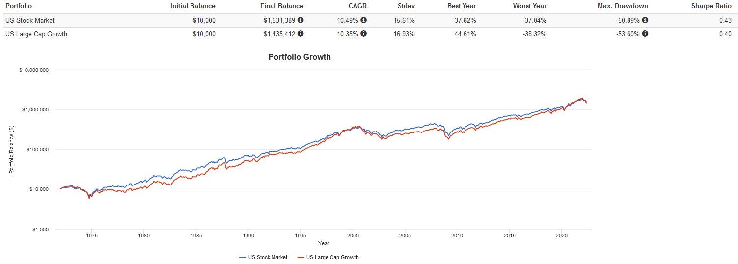 Growth stock outperformance comes in bursts. As mentioned earlier, they tend to outperform when inflation and interest rates are low. When the opposite is true (like in 2022 so far), they tend to underperform the market. Overall, growth stocks are more volatile, with a higher standard deviation and max drawdown. Investors could reap strong gains after a sustained bull market (like from 2017 – 2021) but will suffer deeper drawdowns during bear markets (like the 2001 Dot-Com bubble).