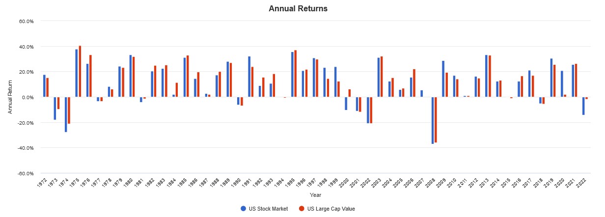The historical evidence seems to validate this. From 1972 to the present, U.S. large-cap value stocks soundly beat the total U.S. stock market, with a greater total return, less volatility, and better risk-adjusted returns. Looking at the annual returns, we see that this outperformance occurs in sustained bursts. While growth stocks outperformed in much of the last decade, value stocks are making a strong comeback in 2022, with U.S. large-cap value stocks only down -1.6% compared to the total stock market at -14.24%.