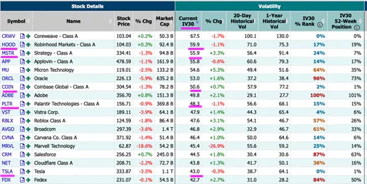 High-volatility names with over $50B in market cap (as of August 29, 2025) such as HOOD, MSTR, COIN, PLTR, and TSLA consistently top the charts for implied volatility¹.