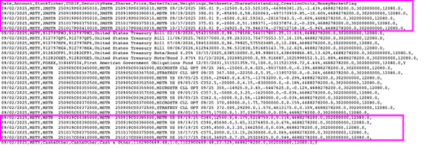 MSTY builds a synthetic forward³ position on MicroStrategy (MSTR) by going long calls and short puts, a setup known as a reverse conversion⁴. It then sells additional calls against that forward to collect income from implied volatility¹. Cash received from investors is invested in short-term Treasuries to generate additional yield.
