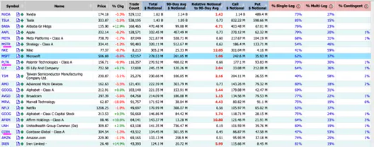 On August 29, 2025, MSTR, TSLA, PLTR, COIN, and NVDA all ranked among the top 20 names for single-stock options volume, indicating strong liquidity and tight bid-ask spreads.