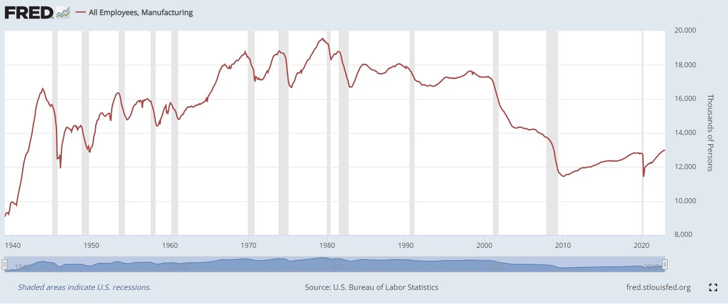 Historically, the manufacturing sector has played an integral role in the US economy, with it accounting for 25% of US GDP in the 1980s. However, over the past four decades, contributions from the manufacturing sector to the US GDP have steadily declined, with it accounting for approximately 11 % as of 2021. While the decline in US manufacturing can be attributed to various economic developments, namely globalization, the transformation of the US into a service-based economy, and companies outsourcing production to countries with lower labor costs, the US remains one of the largest manufacturing economies in the world, and manufacturing continues to play a significant role in the overall health of the US economy.