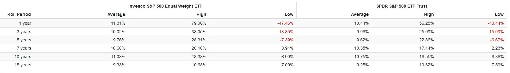 Historically, RSP has eked out a better return than SPY, at the cost of higher volatility and drawdowns. On a rolling basis, the latter squeaked out a minor advantage over a 15-year period.