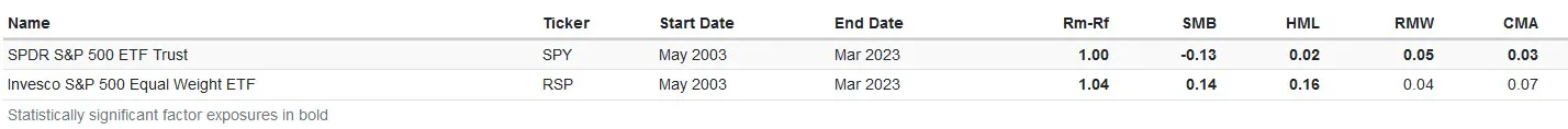 To examine this further, I conducted a factor regression of both RSP and SPY for exposure to the five Fama-French factors: market (Rm-Rf), size (SmB), value (HmL), profitability (RmW), and investment (CmA), respectively, to understand what drove differences in their returns.
