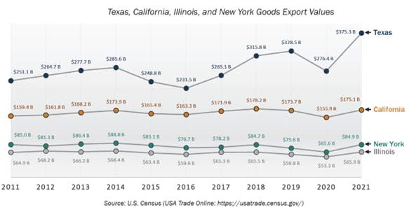 Beyond taxation, the infrastructure landscape of Texas is among the most developed in the nation, with diverse transit options, including roadways, highways, and seaports. Regarding the latter, the Port of Houston is regarded as a top ranked U.S. port in foreign waterborne tonnage (2022: 220.5 million short tons) and the second ranked U.S. port in terms of total foreign cargo value (2022: $240.1 billion). By having a strong and versatile infrastructure network, tangential industries such as Manufacturing are also able to thrive. It is therefore no coincidence that Texas is the second largest manufacturing state, with 17,637 manufacturers employing 1,088,582 workers as of 2022. This is noteworthy, as Texas has been the state with the highest value of exports since 2011.