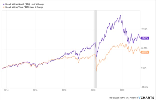 The Russell Midcap Growth Index, overall, has exhibited strong performance over the past decade; though against the backdrop of a rising rate interest rate environment and general economic uncertainty – performance has fallen in recent years.
