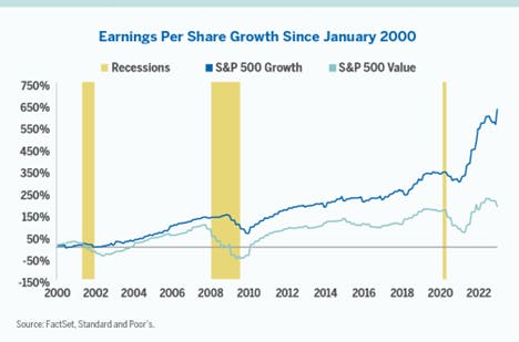 As noted by research conducted by Alger Asset Management, growth stocks have exhibited stronger business fundamentals in past recessions than more economically sensitive value stocks. Over the past three recessions, the average decline in growth stock EPS of -16% was about one-third that of value stocks (-54%). Given that growth equities are propelled more by secular progress, driven by market share gains through industry disruption, as the market environment becomes increasingly tense, the firm believes that growth-oriented firms are better positioned to gain market share and expand, regardless of the macroeconomic environment.