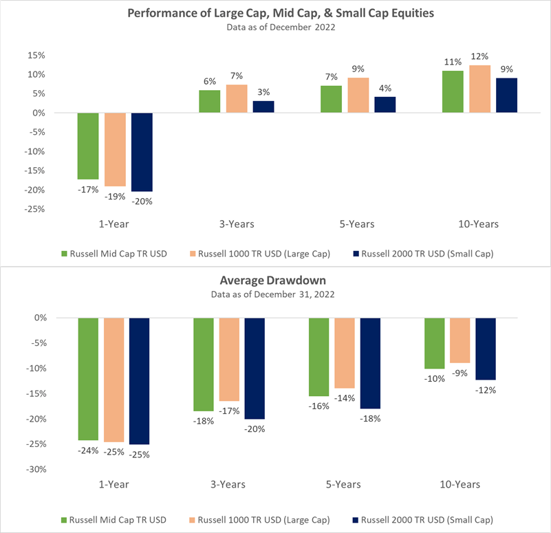 The mid-cap equity category has both fast-growing, young companies that have outgrown their small-cap origins, as well as mature companies operating in stable and profitable corners of the market. Though small-cap equities tend to exhibit greater volatility, and large-cap equities tend to be slow-growing, mid-cap equities capture the best of both worlds, as they are less volatile than fast-growing small-caps and have more growth potential than mammoth large-cap companies.