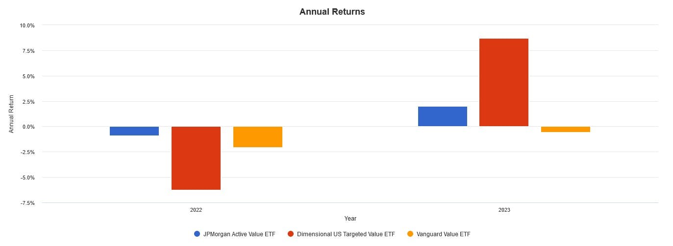 I'm not surprised. According to SPIVA, only 58.70% and 39.46% of actively managed U.S. large-cap value ETFs have underperformed the S&P 500 Value Index over trailing one- and three-year periods. This shows that actively managed value ETFs can shine over the short to medium term.