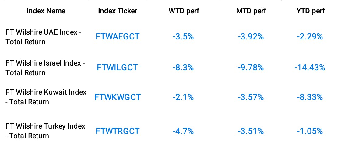 This bearish trend has extended across multiple countries in the region, with stocks losing momentum in Turkey, Kuwait, Saudi Arabia and the UAE. As an illustration, the FT Wilshire Turkey Index (FTWTRGCT) and the FT Wilshire UAE Index (FTWAEGCT) lost 4.66% and 3.51%, respectively.