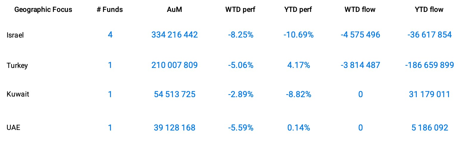 Against this gloomy backdrop, Israeli equity funds reported an average loss of 8.25% over the week. The iShares MSCI Israel ETF (EIS), which is the largest ETF exposed to Israeli stocks, declined by 9.86%, marking its lowest level in three years but capital outflows remained limited ($2.5 million this week). The FT Wilshire Israel Index (FTWILGCT) also illustrates the huge drop in the market, registering a decline of 8.32%.