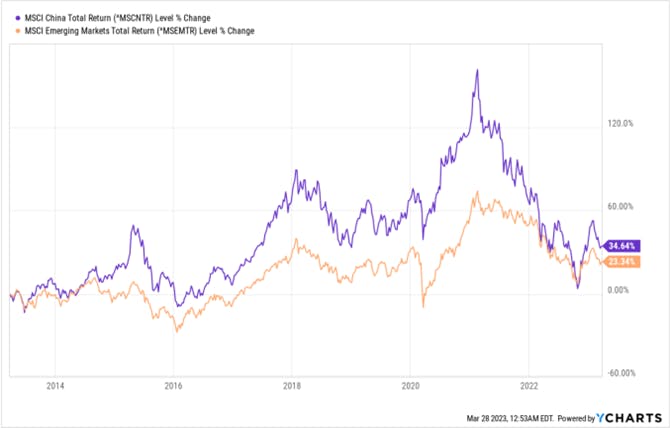 The economic importance of China within the MSCI Emerging Market landscape is evident when looking at the data. As observed from the 10-year comparison chart, the performance of the MSCI Emerging Markets Index is strongly influenced by, and mirrors, the return profile of the MSCI China index.