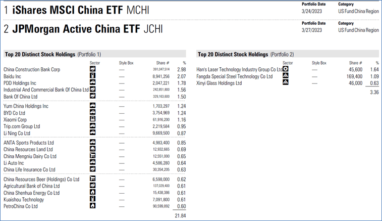 As noted earlier, JCHI will reflect the best ideas within the Chinese equities space, thus the portfolio management team will be deliberate in the businesses they choose to include within the portfolio. As indicated on the ETF’s product page, the number of holdings within the fund is 55, as of March 2023. While index-replicating ETFs like iShares MSCI China ETF will aim to capture the Chinese equities space in its entirety – the intentionality present within JCHI will be reflected in its holding’s composition. When comparing the current holdings of JCHI with the iShares MCHI China ETF, there are common notable names such as Tencent and Alibaba present, however, there are a few distinct differences, such as Fangda Special Steel Technology Co Ltd and Xinyi Glass Holdings Ltd. Though the difference between the ETFs is small, its presence highlights the measure of active management occurring within the investment solution.