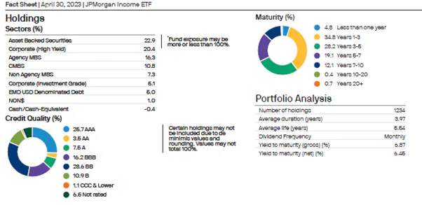 By implementing these additional assets and dynamically adjusting their allocations as market conditions change, JPIE manages to deliver an attractive 6.45% net yield to maturity as of April 30th, 2023, while keeping duration low at 3.97 years. This comes at a reasonable 0.42% expense ratio.