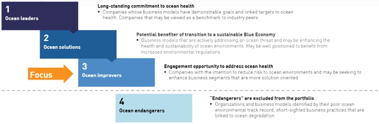 Once the manager identifies companies that meet their investment criteria and have the potential meaningful shareholder engagement, they are grouped into three categories critical to ocean health and the blue economy: Ocean Leaders, Ocean Solutions, and Ocean Improvers; the latter offers the biggest potential for engagement opportunities. As shown from the illustration below the fund will focus primarily on companies classified as ocean improvers, as they have the greatest potential for change and value appreciation over time.